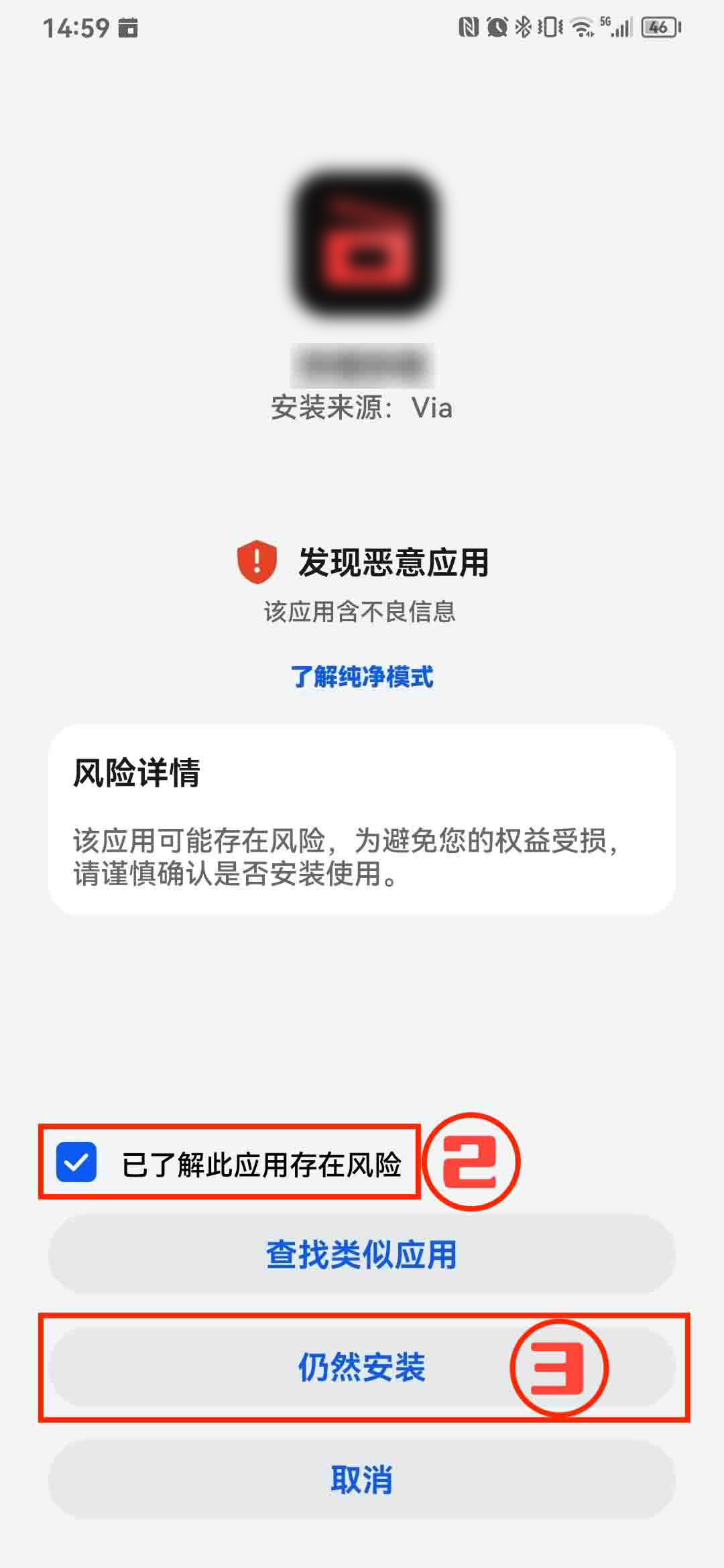 2.再次点击apk安装,点击 [了解风险] ,勾选 [已了解此应用存在风险] 并点击 [仍然安装]