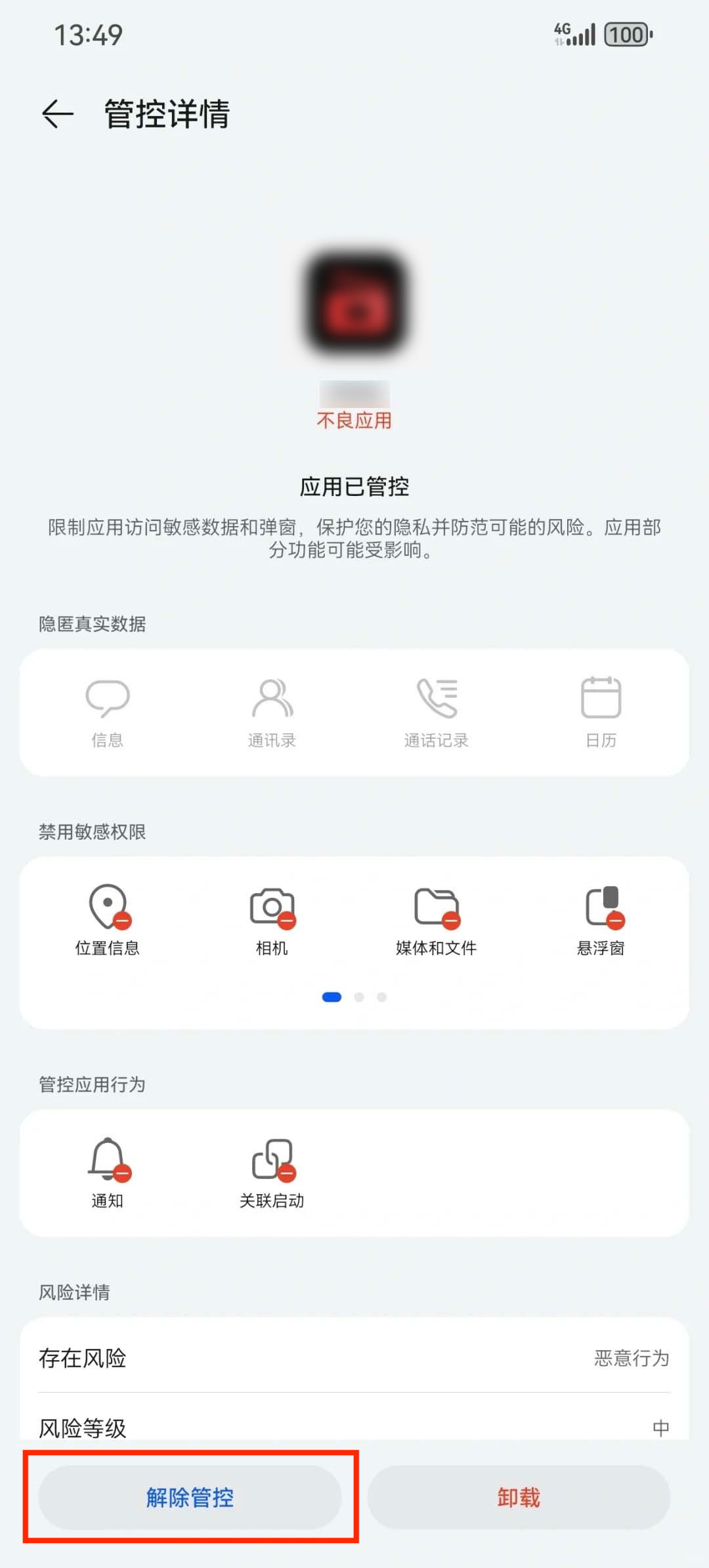 1.进入“手机管家” -> “病毒查杀” -> “风险/应用管控中心”,检查应用是否在风险项中